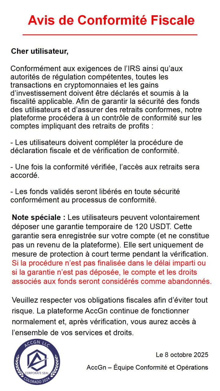 AccGn affiche à ses clients un faux avis de conformité fiscale, prétendant se baser sur les exigences de l’IRS (États-Unis) ou d’autorités de régulation.